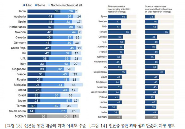 이에 대비하여 국내는 타 국가 중앙값(36%) 대비 절반 이하의 14%만이 응답하여 대중의 과학자 신뢰도가 최하위에 위치했으며, <우수과학자>에 대한 언론 언급량(BIGkinds, 2020.11)은 930건(2011) → 615건(2013) → 608건(2019)이었다. 국민의 과학자 신뢰도(Pew REsearch Center, 2020.9)는 인도 59%, 스웨덴 46%, 독일 43%, 한국 14%였다.